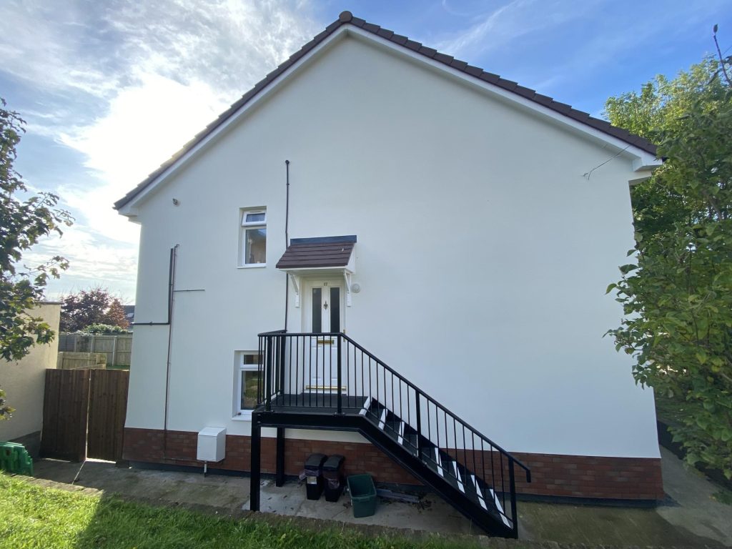 The property had two exterior staircases which were built into the external fabric of the building providing access to the first-floor flats. Two options were considered to minimise cold bridging in these areas: 1. To maintain the structures and insulate the internal walls to the kitchen and living room on the other side. 2. To remove them, make good the external leaf and continue the EWI over the whole external elevation, providing a safe temporary access incorporated into the scaffolding and installing a new freestanding prefabricated stairs and landing on completion. Both options would present inconvenience to the tenants particularly as the first option would require significant work in their homes including the removal and replacement of their kitchens. It would also make the rooms slightly smaller. Following consultation with the residents it was decided to undertake option 2 and use the experience gained as a test bed for other similar projects in the future. The timing of the works posed a challenge, but it was not substantial, and the tenants could see the long-term benefits of the solution and were prepared to put up with the inconvenience of having to leave their homes for two mornings to complete the work.